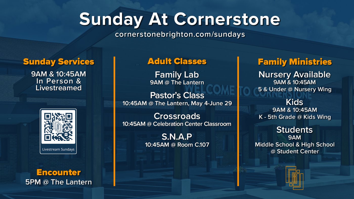 About: The connecting point for New Attenders! A gathering created to welcome and introduce individuals to Cornerstone. All the information you need to get acquainted and navigate your first few months at Cornerstone. (Building Tour, Mission and Essentials, Communication, Intro to Pastors and Staff, Discipleship Path)
