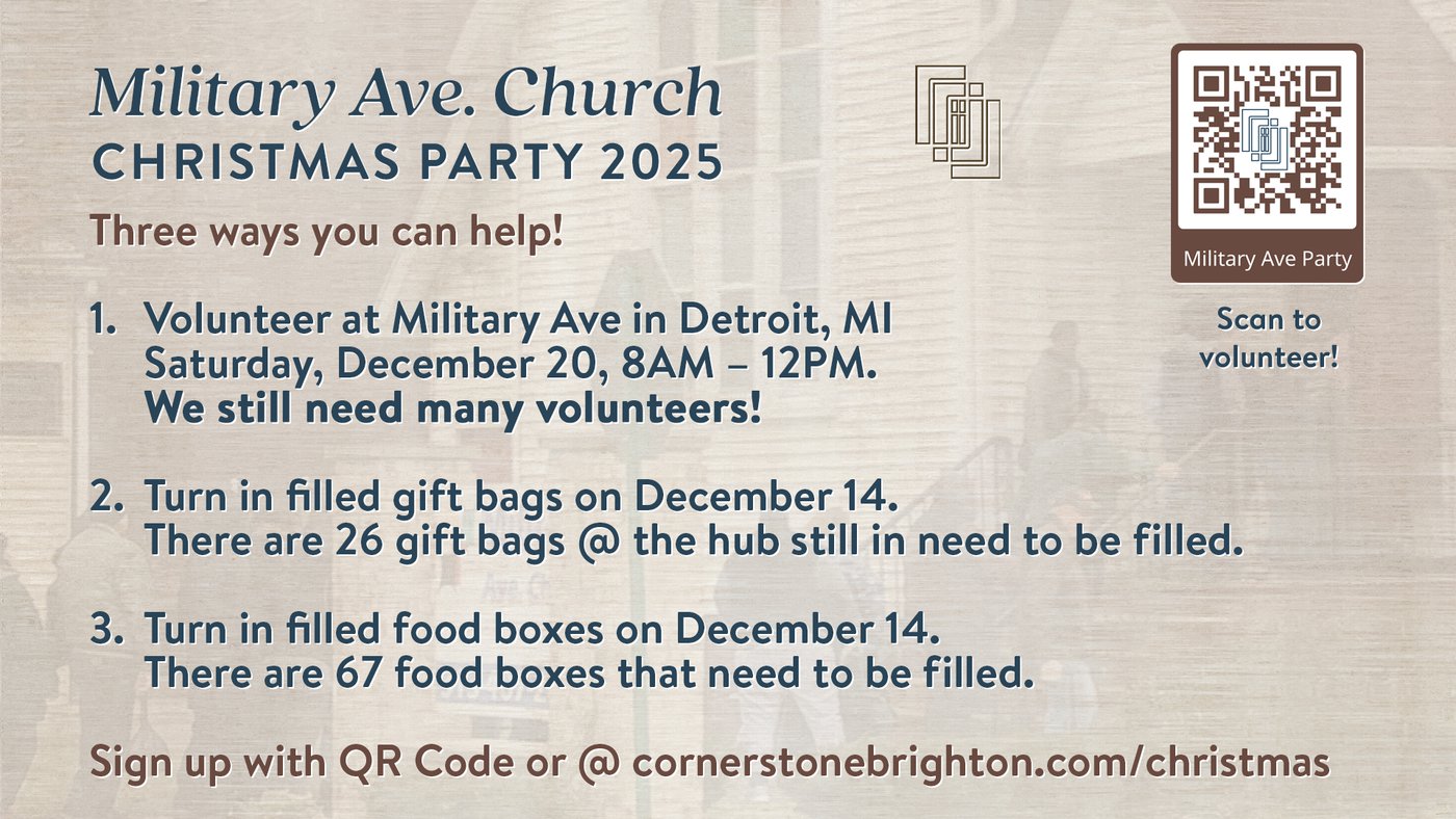Please plan on arriving at Cornerstone ready to pull out, Saturday, December 20 at 8AM to carpool to Detroit. If you prefer to meet at Military Avenue, plan to arrive around 8:45AM. Parking is limited so please carpool when possible. The event will wrap up around noon.